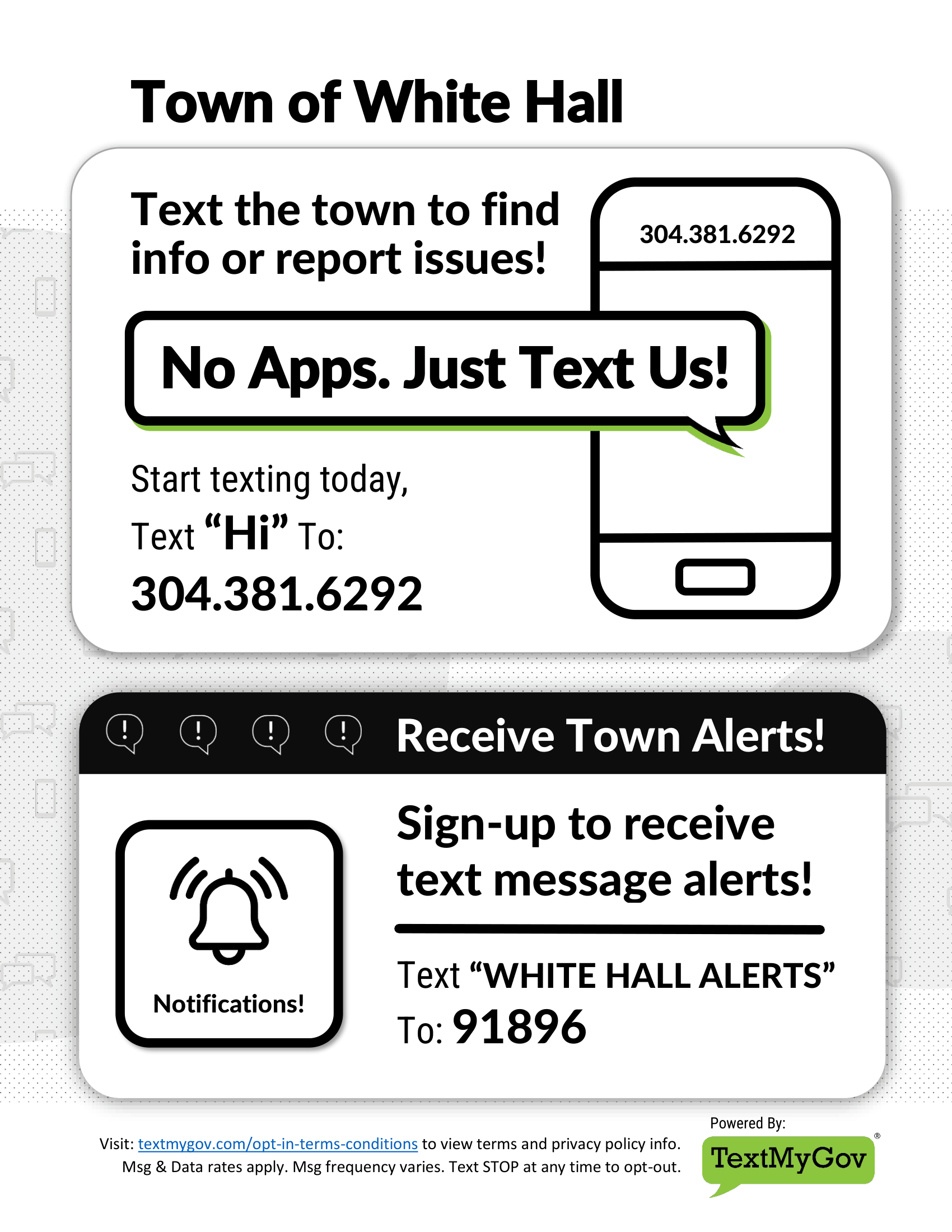 text “Hi” to the Town of White Hall at: 304-381-6292
