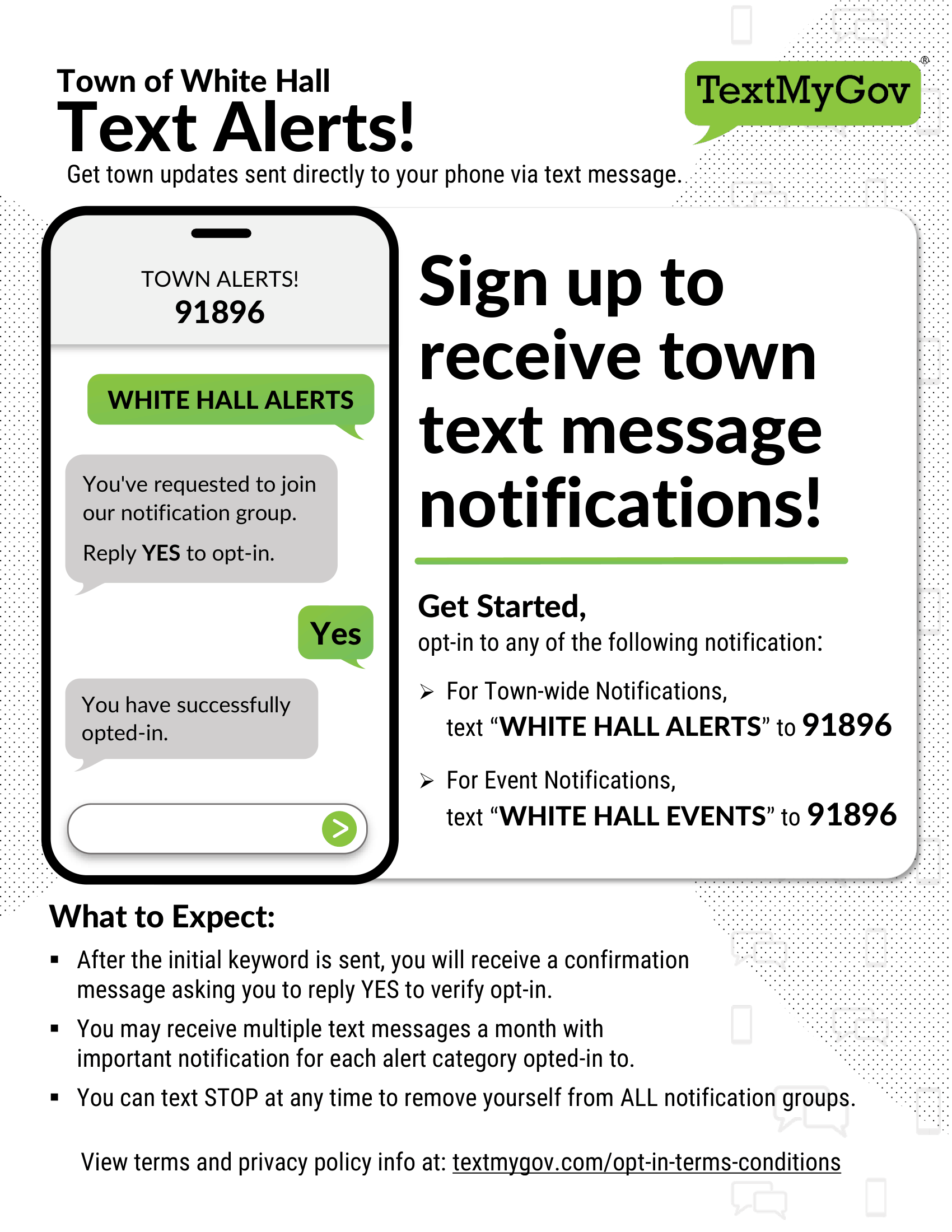 After the initial keyword "WHITE HALL ALERTS" is sent, you will receive a confirmation message asking you to reply YES to verify opt-in.